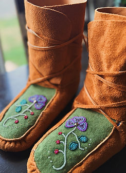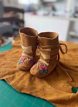 I started making moccasins in the spring of 2025, after finding two moccasins made by my late kokom. I found a newborn moccasin in the plains style, and in the pucker toe style in a bag of hide scraps from her fabric bin that I received after she passed away in 2019. To read more of my journey you can read my story on my about page. Below are some examples of various moccasins I've made so far.